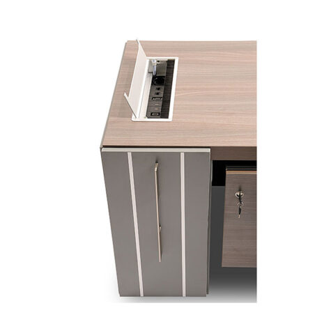 میز مدیریت سهند از امکاناتی نظیر درب ریلی و کشوهایی با مکانیزم آرام بند، مخصوص بایگانی پرونده و سایر لوازم کاربردی سود برده و دارای محفظه ای ویژه جهت نگهداری کیف و لوازم شخصی است. این محصول مجهز به داکت عبور سیم بدون سوکت و یک الکتریک باکس با امکاناتی از قبیل پریز برق، شبکه، سوکت میکروفن، USB و VGA میباشد.